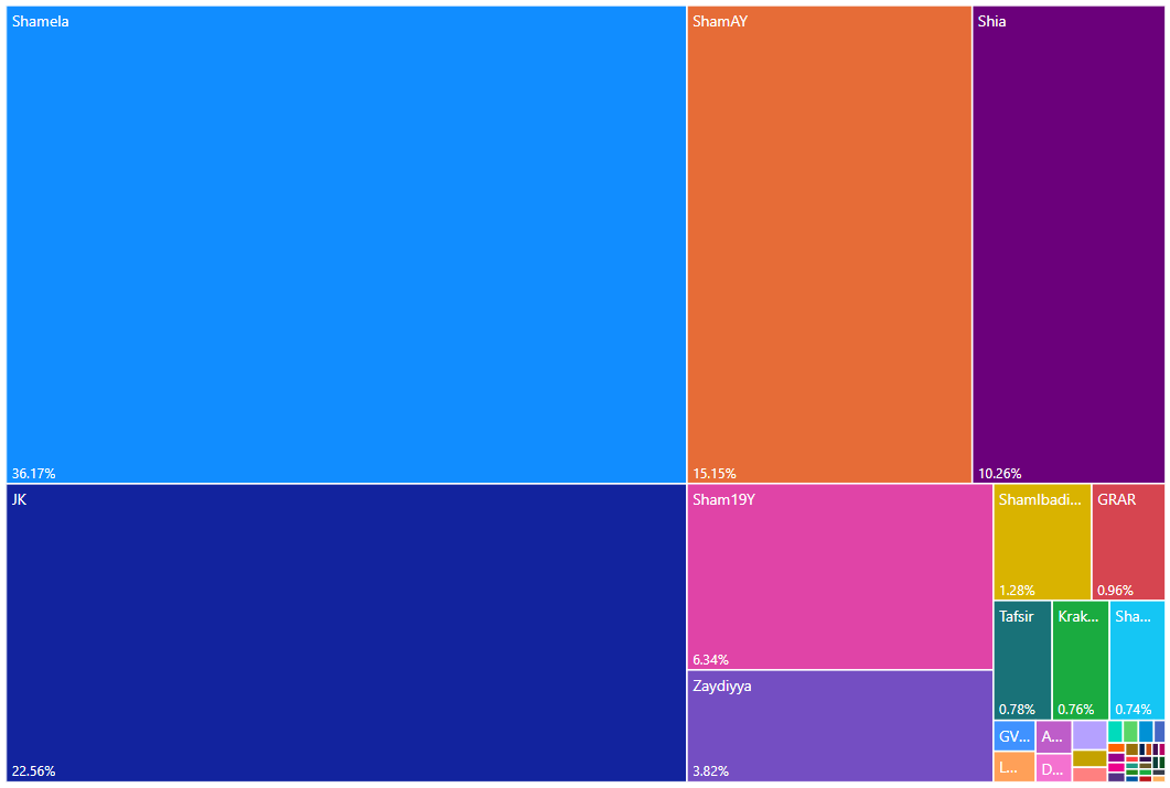 Figure 1 Treemap diagram representing the source collections of the texts in the OpenITI corpus (release 2021.2.5) About 75% of all texts come from three collections: al-Maktaba al-Shamila (Shamela + Sham 19Y), al-Jamiʿ al-Kabir (JK) and ShiaOnline (Shia).