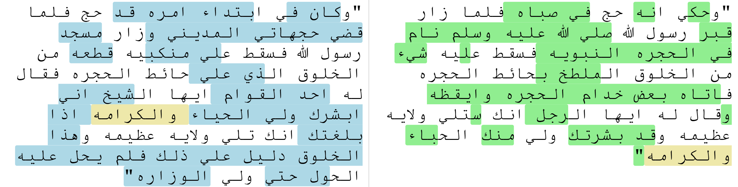Figure 1: This is an example of text reuse with a transformation, in the KITAB diffViewer (unhighlighted text is common between both passages; text highlighted in blue and green is different in both passages, text highlighted in orange is shared but in different locations).