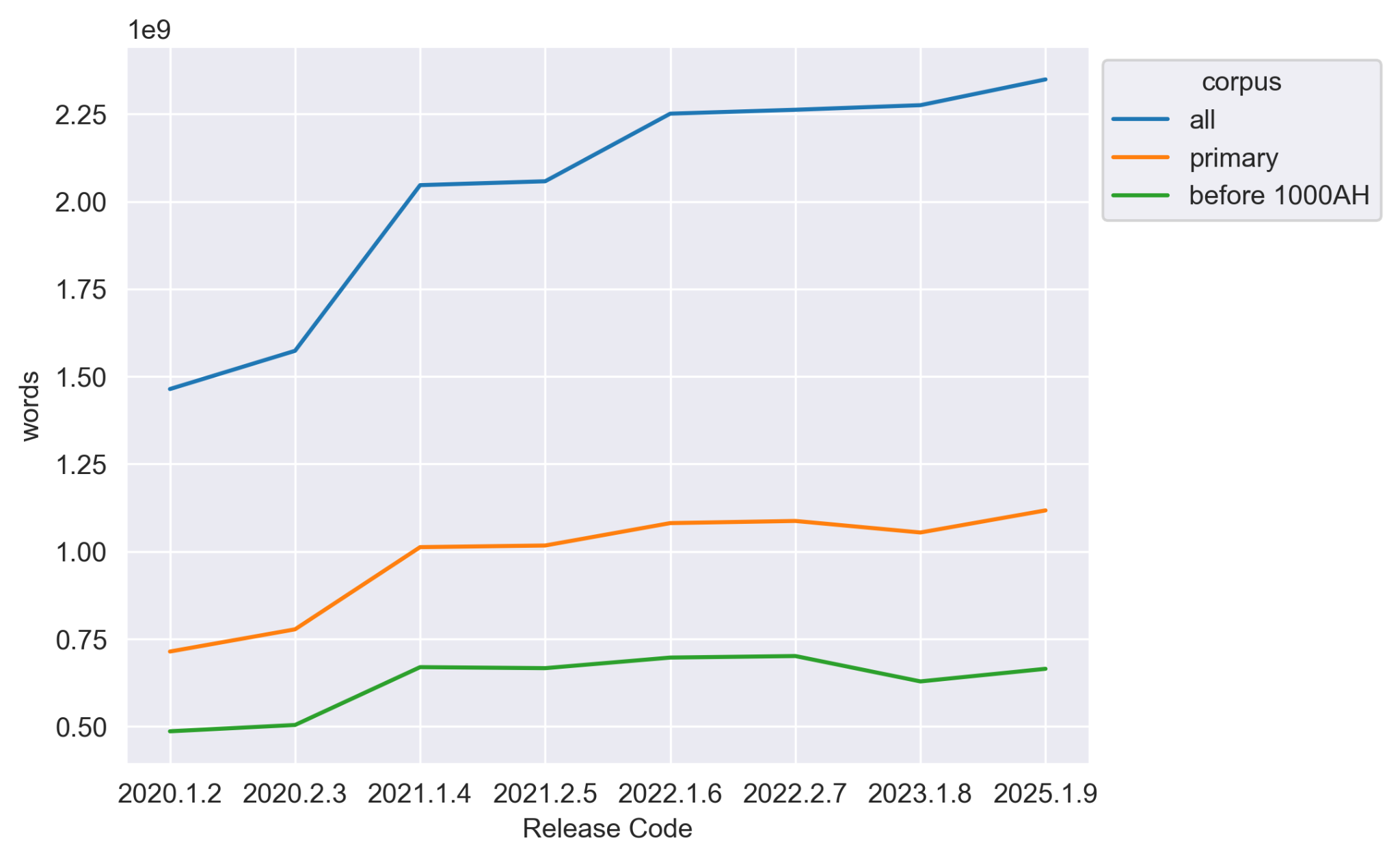 This release includes 9,106 unique books authored by 3,618 authors. When all available versions are taken into account, the corpus now consists of 14,107 text files. The complete collection—comprising books and manuscripts in multiple languages—contains a total of 2,348,893,857 words. Below is an overview of the subcorpora: